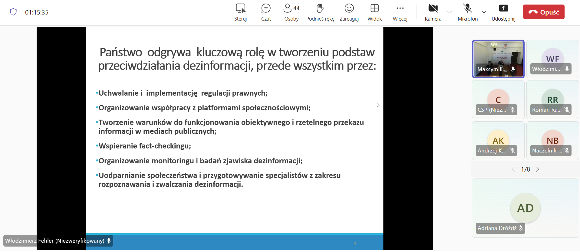 Zwrócił również uwagę na znaczenie systemowych działań państwa w zakresie przeciwdziałania dezinformacji, obejmujących m.in. regulacje prawne, współpracę międzynarodową, wspieranie rzetelnych mediów, rozwój mechanizmów fact-checkingu oraz edukację ogólną i specjalistyczną.